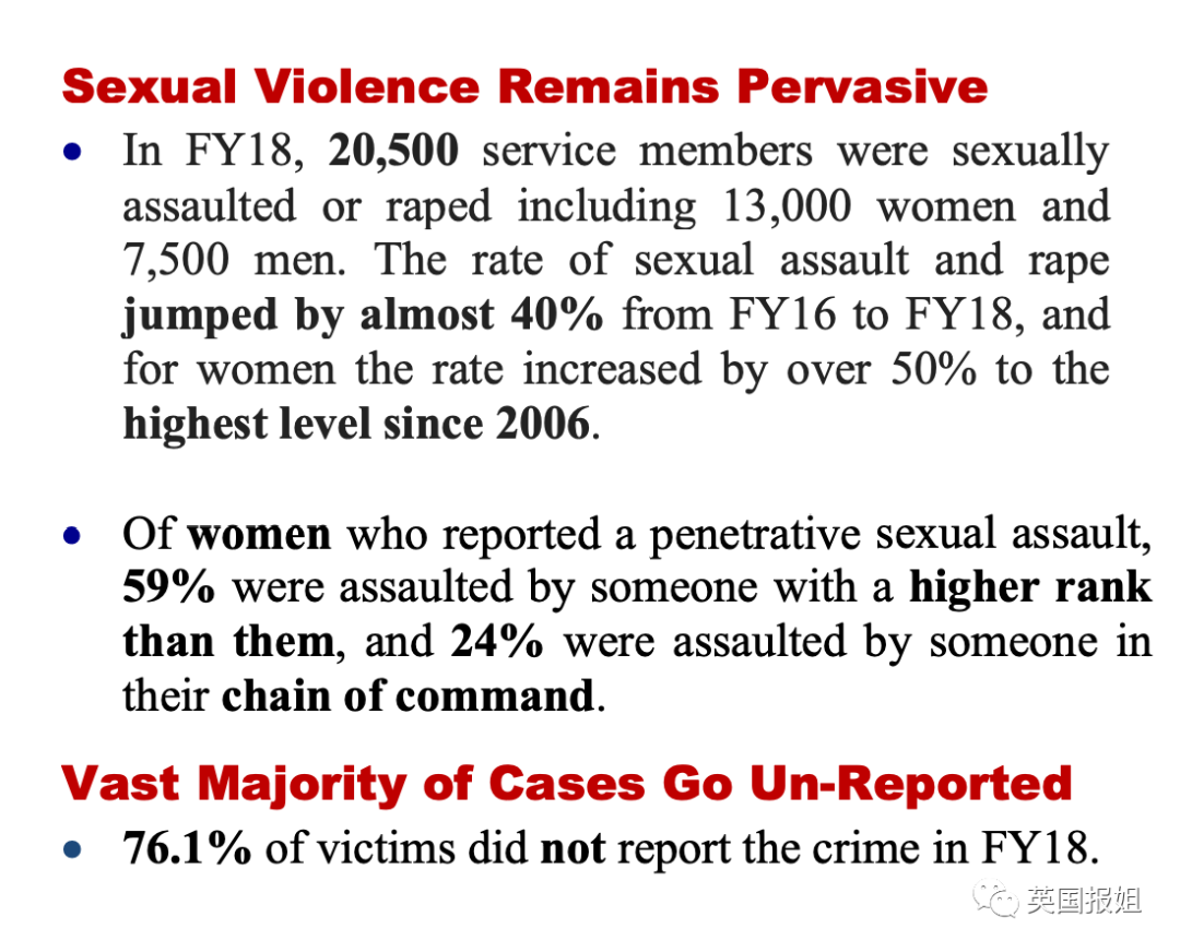 根据为军事性侵幸存者公益组织保护我们的捍卫者的数据,仅2018年,美国共有20500名军人,有被性侵或强奸的情况(13,000女 7,500男 )。但调查发现,其中有76%的服役受害者没有报案。