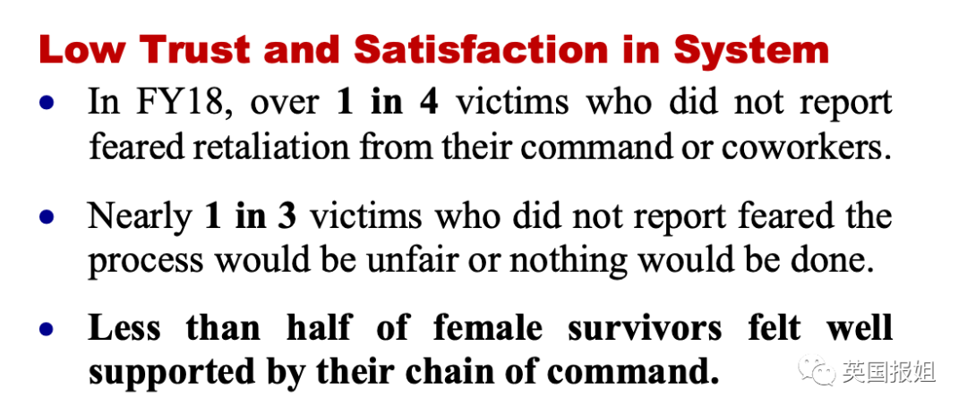 当她们向上级举报时,她们被霸凌,死亡威胁。当她们没有举报而最终遇到危险时,却被告知没有听说过性侵的事。久而久之越来越少的女兵选择举报。