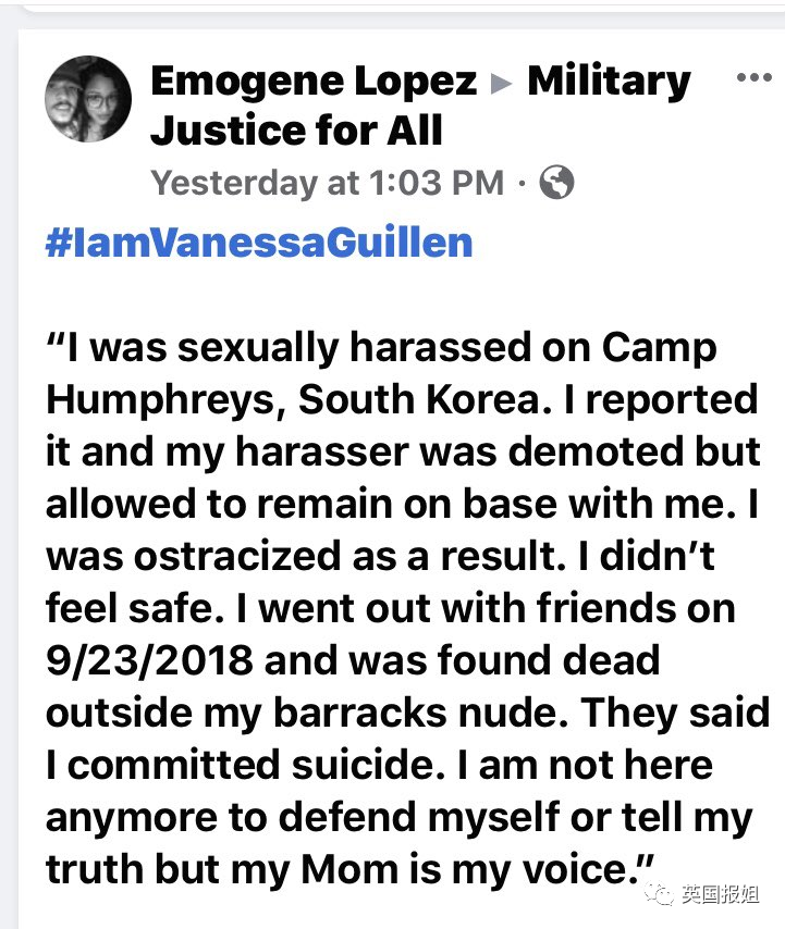 Vanessa Guillen是一名在美国德州胡德堡陆军基地服役的上等兵,她中学时就参加了预备役训练,从军时间已经有十几年之久。