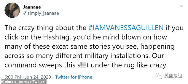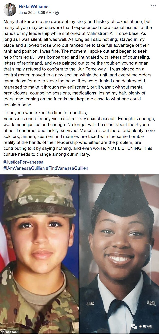 其中一名与vanessa同样驻扎在胡德堡的士兵贾斯敏,告诉网友们:2019年6月,她在同一个基地遭受同事性骚扰。她在朋友的鼓励下报告了上级。