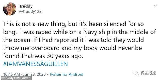 一位来自得克萨斯州的老兵也公开表示,她30多年前在执勤时遭到强奸,犯罪者告诉她,如果举报,她就会被扔下水。因为在海上值勤的日子里,只要把我扔到海里,尸体永远不会被发现。