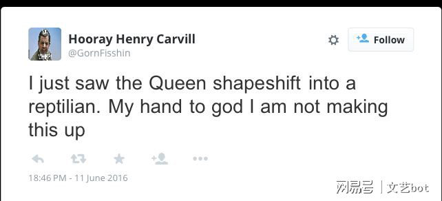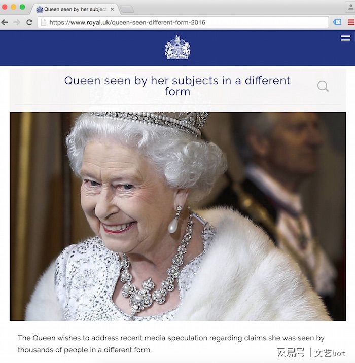 关于英国女王就是蜥蜴人的传说在2000年左右就已经开始流传。而在2016年整个英国为英国女王伊丽莎白二世庆祝其90岁生日时,网络上关于她是蜥蜴人的留言甚嚣尘上,有很多英国民众声称自己看到了女王变身蜥蜴人的过程,有人说自己看到了女王绿色的爪子还有人说女王的眼睛变成了蛇眼!WTF