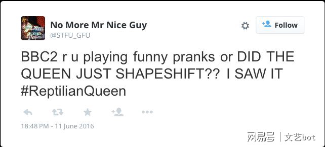 然而,英国BBC第二频道转播的「转换」事件在全国被民众目击,并且「女王蜥蜴人(#ReptilianQueen)」进入了Twitter用户的十大热门话题中。