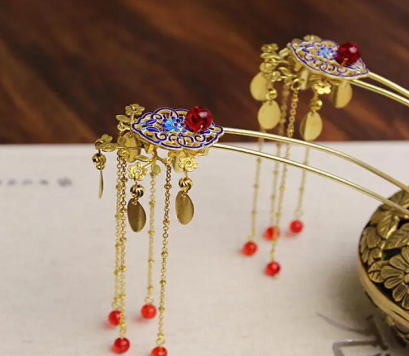 发钗的安插有多种方法,有的横插,有的竖插,有的斜插,也有自下而上倒插的。所插数量也不尽一致,既可安插两支,左右各一支; 也可插上数支,视发髻需要而定,最多的在两鬓各插六支,合为十二支。