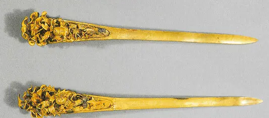 簪:是笄的发展,同样起固定发髻之用。在前端加以纹饰,雕刻成植物(花草)、动物(凤凰孔雀)、吉祥器物(如意)等形,并可用金、玉、象牙、玳瑁等贵重材料制作,工艺也愈发丰富,有錾花、镂花及盘花等。