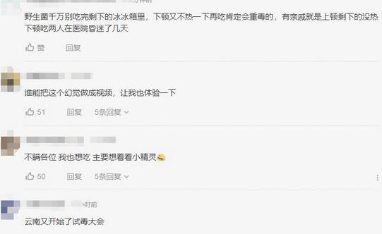 看了该女子的经历后,很多网友表示云南真是个神奇的地方。还有网友评论说:云南人对于中毒这件事,一直孜孜不倦。还有网友搞笑评论:在云南想吃蘑菇要三熟,蘑菇种类要熟,要煮熟,去医院的路要熟。还有一位大胆的网友说:不瞒各位我也想吃,主要想看看小精灵。