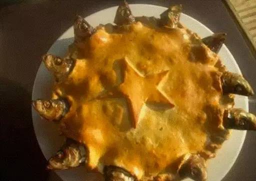 腐国传说中的仰望星空鱼 一群小鱼睁着不能瞑目的双眼,仰望着那湛蓝的星空创造者本来的意图是在烤派的时候让油能倒流,这样就什么材料都不浪费了。 其实,人家英国人也知道这个是个搞笑餐啦(fun dish),只有一些特殊场合或者逗孩子的时候才弄啦。
