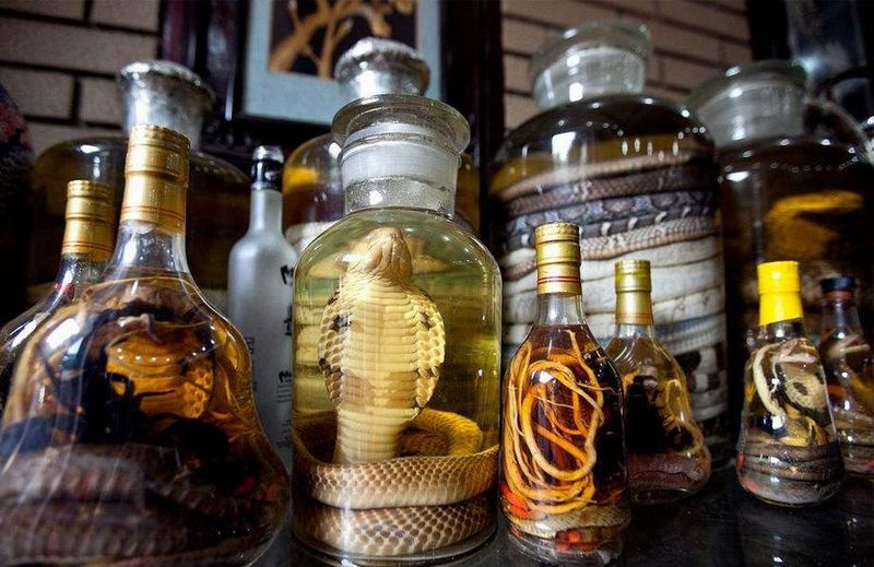 蛇酒在中国最是常见,可内服可外用。内服能增强体质,具有养生功效。而外敷可治疗常见筋骨扭伤、骨关节等疾病。