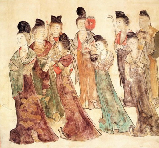 而在唐代,上流女子,喜欢穿着短衫、长裙,上身再披一条像长围巾一样的“帔”,这些长裙子经常拖到地上,裙腰则高到胸部,有些则露出半乳。例如李世民的女儿新城公主去世后,在日后考古发掘的新城公主陵墓中,就出土了许多半露胸部的女俑。