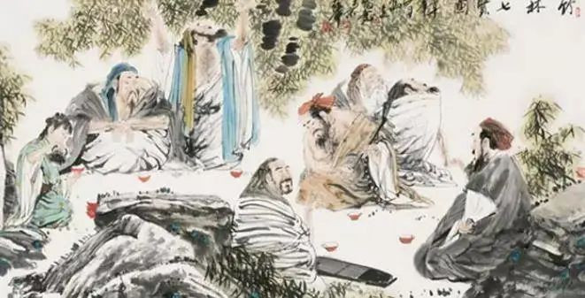 竹林七贤——嵇康、阮籍、山涛、向秀、刘伶、王戎及阮咸这七个老友经常聚在竹林里喝酒、纵歌,肆意酣畅,穿柔软轻薄的衣服,腰系长带,随性不拘礼法。他们在当时算是文化名人,相当于今天的明星。