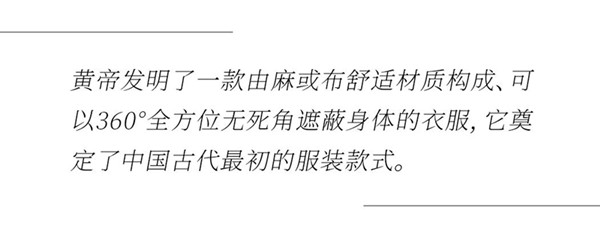 于是,他和胡曹、伯余两位副手组成一支执行力极强的设计团队,在共同奋战三天三夜后,他们的成果——上衣下裳终于成功面世。这是一款由麻或布舒适材质构成、可以360°全方位无死角遮蔽身体的衣服,它奠定了中国古代最初的服装款式。