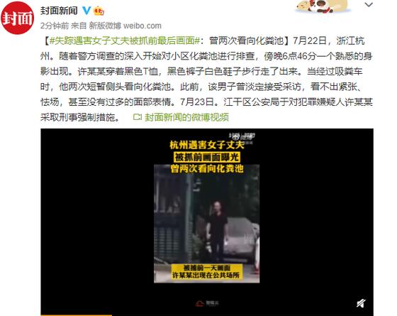 7月22日,浙江杭州。随着警方调查的深入开始对小区化粪池进行排查,傍晚6点46分一个熟悉的身影出现。许某某穿着黑色T恤,黑色裤子白色鞋子步行走了出来。当经过吸粪车时,他两次短暂侧头看向化粪池。此前,该男子曾淡定接受采访,看不出紧张、怯场,甚至没有过多的面部表情。7月23日。江干区公安局于对犯罪嫌疑人许某某采取刑事强制措施。