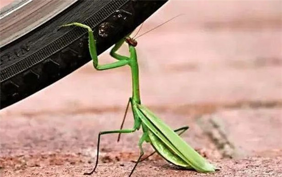第一个是螳螂。螳螂举起两个臂膀来,想把车子挡住,的确是自不量力,自以为是。