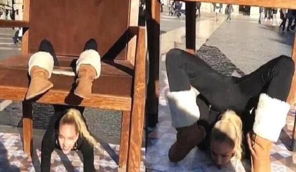 紧跟着,她的头从椅子的下面钻出来,当她的头面向观众时,她的脸上露出了美丽的微笑。看起来,她信心十足。然后,她将腿往前伸,用双脚站住。此时,她的头完全趴在了地上。这是一种普通人看起来非常难受的姿势,但对于她来说,是家常便饭。(以上为阿根廷美女柔术演员当街表演后仰钻椅子的场景,身体随意卷曲,令人惊叹)