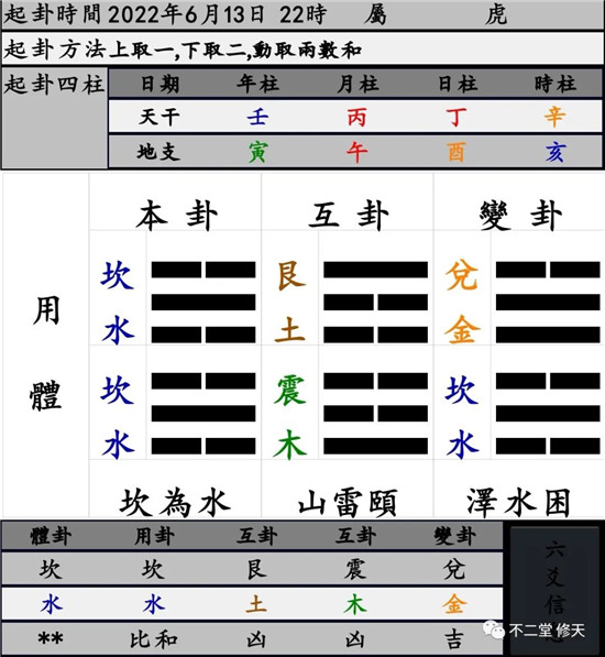 坎卦位于正北方位,其宫位内藏子水,那么形成子午相冲,水火不容之势,坎子水为智商,被火一冲之后,立马上头,行冲动之事,所以当下,此人必然后悔万分,也反馈其出事高度吻合其车牌卦,以及当天月日令分析。