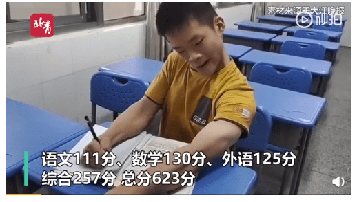 安徽师范大学附属中学高三理科考生姚骏鹏,一名在襁褓中就被确诊为脑瘫的19岁少年成功在2020年高考中考出了623分的高分,高出当地本科一批分数线(515分)整整108分,他的语文、数学、外语和综合分别拿到了111、130、125、257的高分。这样的成绩几乎所有人都是极难以联想到这是出自于一个脑瘫学生的,毕竟绝大多数正常健康学生都是难以获得这样的高分。