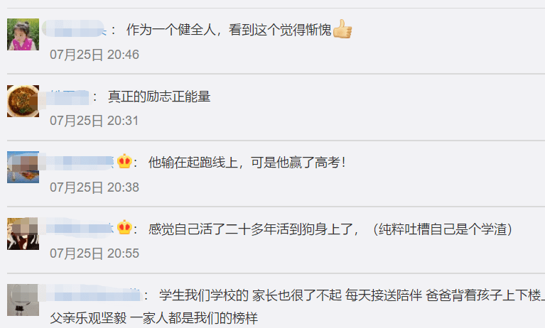 还有网友表示:自己作为一个健全的人,高考很努力的只考了二本,可想而知,他付出了多大的努力,顺间泪奔。