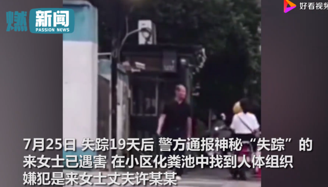 失踪19天后,警方通报神秘失踪的来女士已确认遇害,在小区化粪池中找到人体组织。嫌犯是来女士的丈夫许某某。