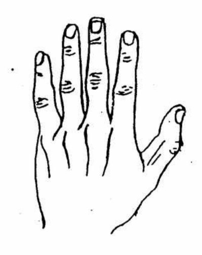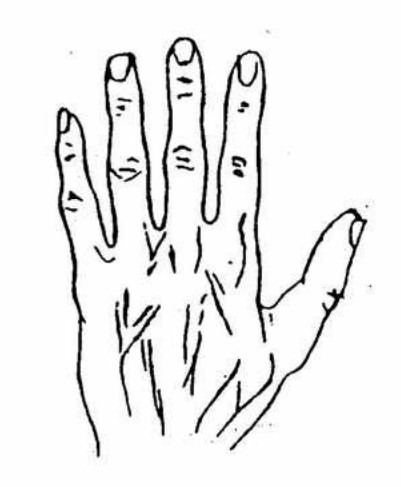 上图手形外状为原始人的手形,读者在鉴定自己手形的时候应做这种伸张状与镜对照,凡类似这种手形者,谓之原始手形,有这种手形的人,性格直,傻,知足常乐,不善用心机,性情粗野,急躁智慧较为迟顿,这种人或务农,或为武或以猎为生者居多。