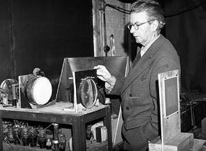 经过18年夜以继日的努力,他终于看到了胜利的曙光。1924年春天,他把一朵十字花发射到3米远的屏幕上,虽然图像忽隐忽现、十分不稳定,但是,它却是世界上第一套电视发射机和接收器。 接着,他想到应该把图像发射得远一点、清晰一点。他把几百节干电池串联起来,使电压达到了两千伏,这样,马达就会转动得更快,使扫描图像的速度加快,以达到理想的效果。