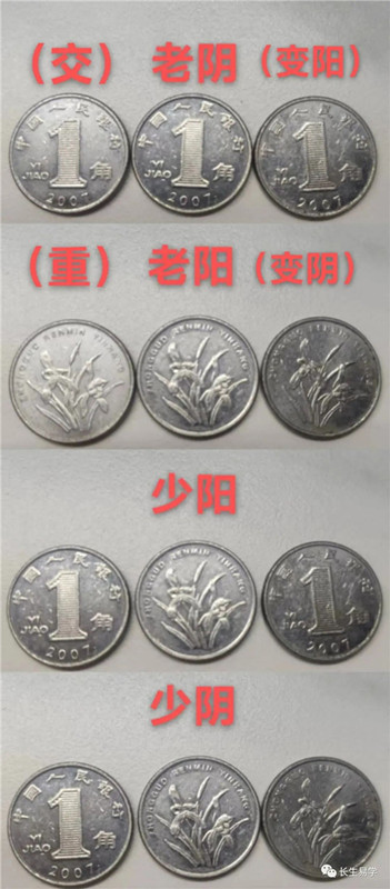 出现三个正面(字),叫做交,是老阴爻,是动爻,发动以后变成少阳爻。