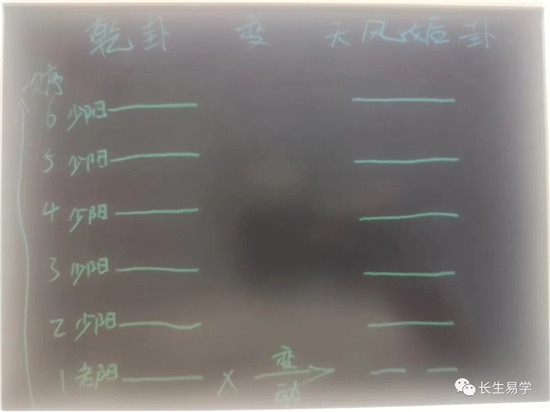 例如如果我摇出来的乾卦初爻是老阳爻(动爻),初爻阳动变阴,上卦(外面456三爻)不变,依然是乾卦,内卦(里面123三爻)一爻变了,就成了巽卦;