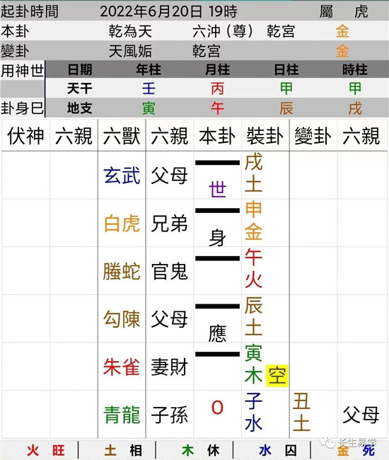 另外,古人为了丰富六爻占卜的信息,还加入了月建、日建信息(爻卦的时间),以及六神信息(青龙、朱雀、勾陈、腾蛇、白虎、玄武),有人统计过,六爻的总共结果有64*64*12*12*6=大约三百多万种,在这之余,古人也把阴阳五行生克、天干、地支、干支纳音、以及六亲关系给融入了六爻卜卦系统;
