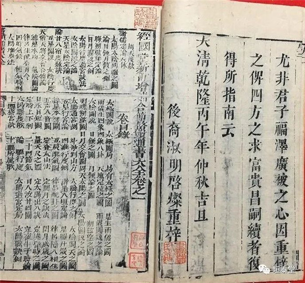 全序前成弘间,家 宗立先生。以克择造人之福者数十年,著有《通书大全》行世。後数世,而曾孙月涛先生习其道,踵而行之,其义益精,其理益明。以年月日时富贵人者,又七十馀年。每日执贽求课,户外履常满。其福泽所及,几半天下。中载若斗首,若河洛等篇,真剖千古之秘,发百家之蒙者也。书行五十馀年,四方搆其本,遵而用之。所惠者甚博,所及者甚远。後以兵燹之故,遂致残毁。夫以福世之物,而忍听其灰烬,先生有灵,应亦太息,且尤非君子福泽广被之心。因重梓之,俾四方之求富贵昌嗣续者,复得所指南云。