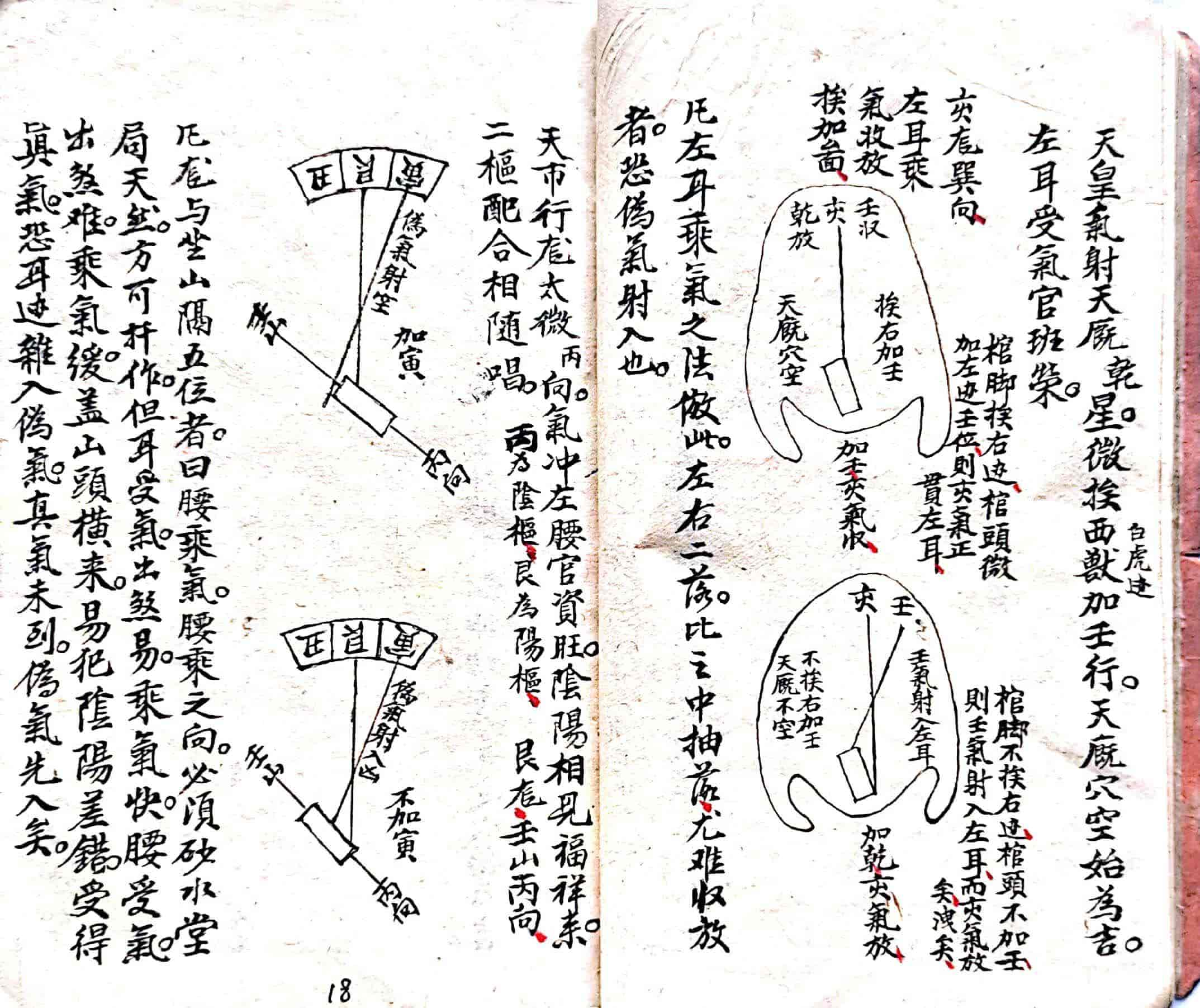 夫塟乘生气,乘穴中所受之生气也,大凡有受则有乘,人脑无窍,气冲则散,散则生气不聚,而穴无结矣,惟耳腰输可以受气,耳受则肩乘,腧受则腰乘,腰受则腧亲,正来者耳受,斜来腧受,横来者腰受,龙与塟位隔一位二位者,為耳受肩乘,隔三位四位者,为腰受腧乘,脉从左来,气从右受,脉从右来,气从左受,左受者穴挨右,右受者穴挨左,若挨加不得其位,则龙落空亡,故曰母蹈空亡,气从耳入官易期,气从腰腧官应迟,耳腰乘气有多寡,正脉甚勿差毫厘。