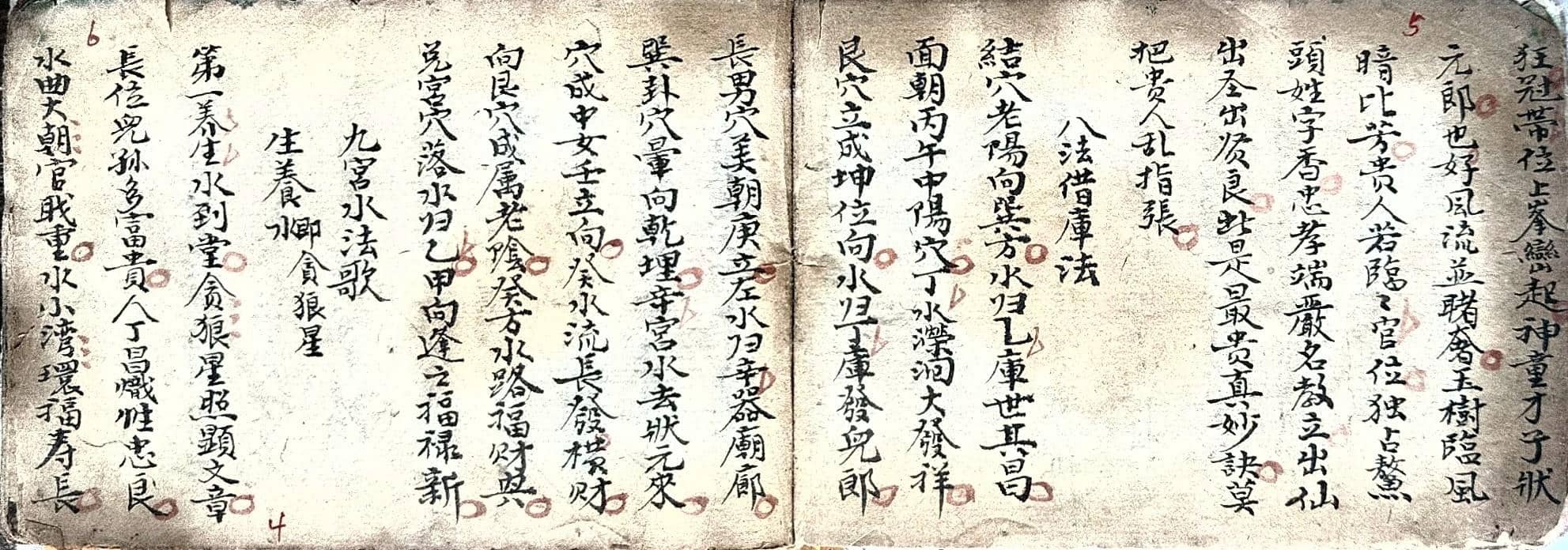 内容包括:认富贵盘贫贱穴法歌,八法借库法,九宫水法歌,横龙穴诀,十二龙理气歌,龙上八杀,洛书数合十法,辨五星吉凶体格,辨二十四山卦位错杂,辨二十四山阴阳差错,辨立穴收水远近大小诀,辨穴星厚薄浅深塟法,辨坐穴燥湿法,辨穴忌空亡流神诀,辨左右前后高低诀,平洋翻向贪狼诀,三元水法,三元旺山旺水诀,三元照神水法,宫神照神水决,体用吉凶歌,山运吉凶歌,龙运二十四山生旺进退,挨星定局,三吉九星掌,起太阳日掌诀,起太阳时诀,起太阴时诀,排山诀,历数太阳掌诀,贵人登天门时,二十四山总论要诀,辨正神忌流神水冲破诀,辨朝迎侍卫四砂,呼龙撒土讃文,九星生尅歌,九曜水歌,九星断诀起例,水城歌,男女生命,宅门合法徵验秘诀等。