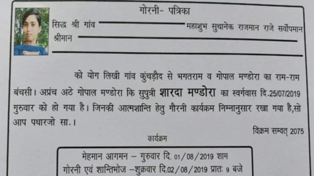 8月2日,一场奇怪的葬礼在中央邦的库格罗德村举行。父亲戈帕尔-曼多拉(Gopal Mandora))在当地的报纸上发布了女儿的讣告,还印制了葬礼举行的通知, 分发给村民和亲友们,邀请他们准时参加葬礼。