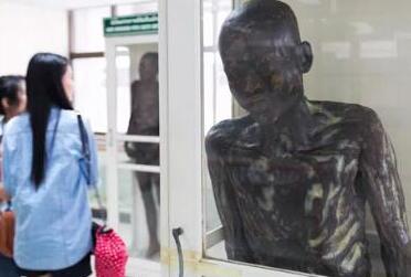 其中最为臭名昭著的一具,被放置在一个1立方米的透明橱窗里,深褐色尸体上还滴着油。