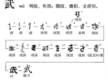 东汉许慎《说文解字》中注释“武”字时,引用了一段典故:“楚庄王曰:‘夫武,定功戢(收敛、停止之意)兵,故止戈为武。’”或许许慎没有见过甲骨文,误解了武字本意,或许许慎怀有文人情怀,认为天下应该息武,劝诫武人不要滥用武力,故意这么说。至于楚庄王这么说,可能是借题发挥、政治作秀,可能是误解了“止”的本意。