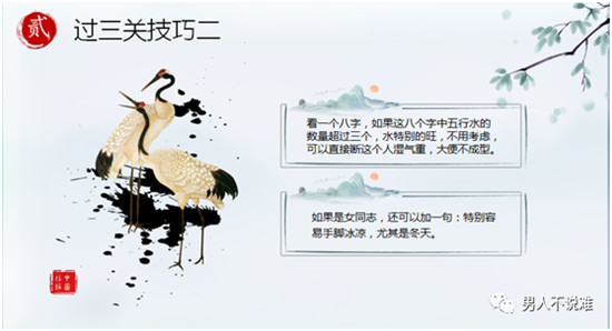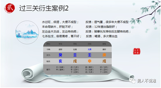 另外再给大家分享一个小技巧。看一个八字,如果这八个字中五行水的数量超过三个,水特别的旺,不用考虑,可以直接断这个人湿气重,大便不成型。如果是女同志,还可以加一句:特别容易手脚冰凉,尤其是冬天。