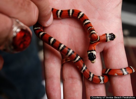 据美国《赫芬顿邮报》9月5日报道,美国洛杉矶威尼斯海滩畸形秀(Venice Beach Freakshow)的老板托德雷(Todd Ray)近日以5万美元(约合人民币32万元)的高价购入了自己心仪已久的双头蛇美杜莎(Medusa)。