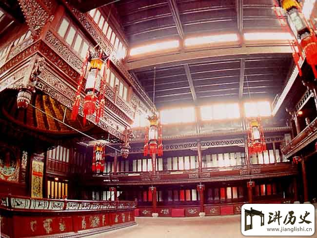 建于清顺治十五年,后为庆贺慈禧60寿诞,改名“万福”。戏台近于四方形,在戏台中间用木雕屏隔出前后台,后台三面围以砖墙,台前四根柱,中间两立柱形成表演空间;台下为存放衣箱之处。戏台的两侧还有长廊,长廊上设看戏楼,楼前是广场。