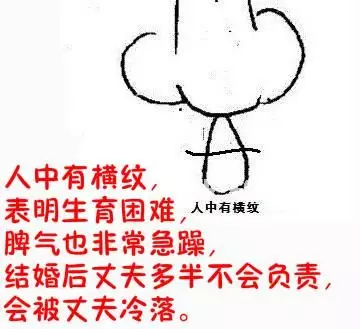鼻子下面与上唇之间的部位,相学上称为「人中」。如果笑起来,人中有横纹,这个人是命运多舛的。要是人中也不够清晰的话,容易得妇科疾病,不孕不育的几率也会增大,而且财运和人缘都比较差。这样的人,一般性格和脾气都不够好,为人处世急躁、没有分寸,在爱情上也处理不好两性关系,很容易被人排斥冷落。