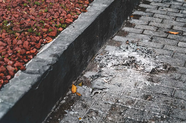 入口处全部以路障相隔,严禁车辆通行。门正中立一造景,一方面是以黑石呼形喝象了一座万仞高山,有高山仰止的象征义,亦表对死亡之敬畏。
