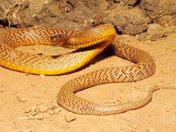 8、细鳞太攀蛇:细鳞太攀蛇 是全世界最强毒性的陆栖蛇种,一次毒液就可杀死20万只老鼠,形体比普通太攀蛇要小,分布于澳洲中部的维多利亚沙漠及附近,细鳞太攀蛇生性害羞,当防御时,身体会离开地面。
