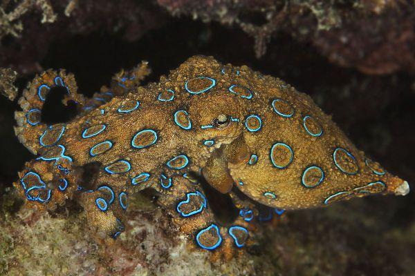 3、蓝环章鱼:蓝环章鱼是一种很小的章鱼品种,臂跨不超过15厘米。可以饲喂小鱼、蟹、虾及甲壳类动物,会用很强的毒素(河豚毒素)麻痹猎物。在海洋中,蓝环章鱼属于剧毒生物之一,被这种小章鱼咬上一口能致人死亡。但这种章鱼不会主动攻击人类,除非它们受到很大的威胁。