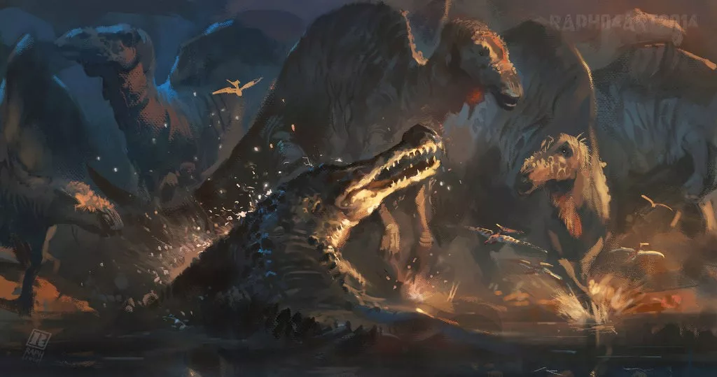 从生存年代上看,帝鳄是本文三大巨兽中最古老的了,生存于距今1.2亿年的白垩纪,当时恐龙还没有灭绝呢。帝鳄生活的非洲北部就有很多恐龙,这些恐龙靠近水边的时候一定要格外的小心,因为很可能正有一只帝鳄就藏在水面之下呢!