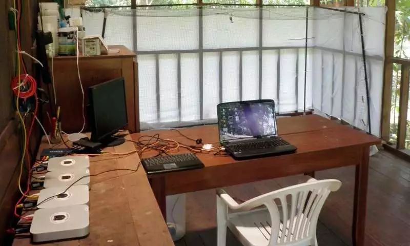塞格雷博士设在野外研究蜂鸟飞行的简易实验室,以及四台摄影机拍摄的数据使得研究人员可以在三维空间重建每只鸟的飞行模式。