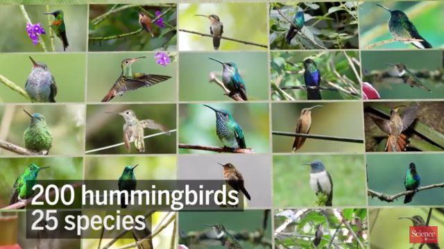 获取这些数据是非常不容易的。在秘鲁,这支团队的测试场地连续两天挤满了成群的蚂蚁。在哥斯达黎加,塞格雷和他的同事们不得不在雷雨的夜晚涉水穿过鳄鱼出没的水域。我们大多都被闪电吓坏了,塞格雷回忆道,他现在是加州帕洛阿尔托斯坦福大学(Stanford University in Palo Alto, California)的一名生态生理学家。科学家们最终获得了25个物种共计207只蜂鸟的视频(如上图)。