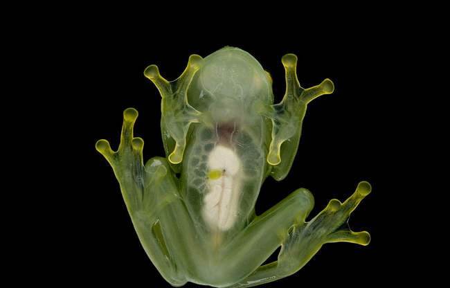 这是一种背部是鲜绿色,而腹部确是半透明状的青蛙。透过腹部的皮肤甚至能清晰的看到它们的身体器官和消化道,不可不说是一种神奇的生物了。