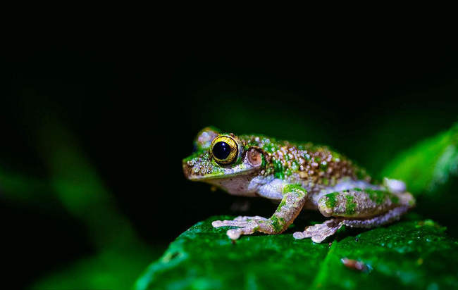 是有着一身白色和棕色迷彩花纹的树蛙,主要是因为它们的栖息环境和一般树蛙不同,因而进化出了这一符合周围环境的保护色。