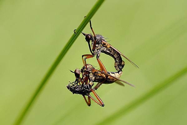 在交配季节,雄性悬挂苍蝇带上礼物给新娘子。通常,它们的礼物是一具死昆虫的尸体。如果雌性接受了礼物,这对夫妻的生殖器就会接合,在交配时,雌性吃着她的美餐,而雄性抓住她的腿来吊住她。但雄性提供的礼物不足的话,在授精完成前,雌性就会飞走。