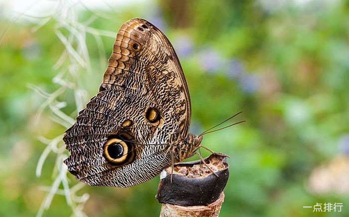 巨型猫头鹰蝴蝶最出名的是翅膀上的眼斑,看起来就像它们自己的眼睛。它们属于猫头鹰蝴蝶科,原产于中美洲和南美洲。这些大蝴蝶的翼展在13到16厘米之间,它们翅膀上巨大的眼睛状图案很像许多掠食者的眼睛,它帮助这些蝴蝶很容易地逃脱捕食者,如青蛙或蜥蜴,也威胁到许多小动物。猫头鹰森林蝴蝶的上翼是黄褐色的,有紫色的边。这些蝴蝶主要以水果为食,寿命125至150天。