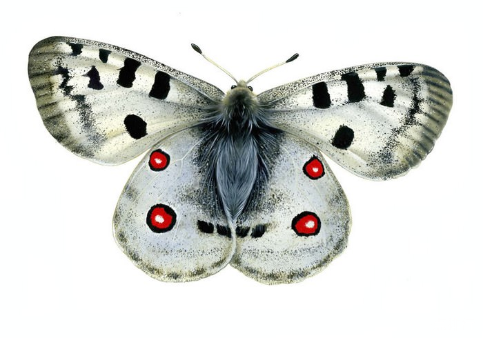 阿波罗蝴蝶有一个美丽的白色身体和迷人的眼点在它的翅膀。在这些蝴蝶的前翅上,你可以看到许多黑色的眼窝,甚至后翅上也有四个红色的眼窝。这些蝴蝶不仅以美丽著称,它们的防御策略也使它们具有吸引力。阿波罗蝴蝶的幼虫是黑色的,它们借助这种颜色伪装。然而,成年蝴蝶不能用这种颜色来伪装,但它们会制造一种臭味来赶走捕食者。