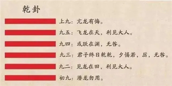 而变化无处不在,其中“乾”、“坤”两卦对应七个爻。“乾卦”是第七个“阳爻”,称为“用九”,“爻辞”为“见群龙无首,吉”;“坤卦”是第七个“阴爻”,称为“用六”,“爻辞”为“利永贞”。为何“乾”、“坤”两卦会多出一个爻呢?因为“物极必反”,盈满则亏而我们古代哲人向来所追求“阴阳平衡”。