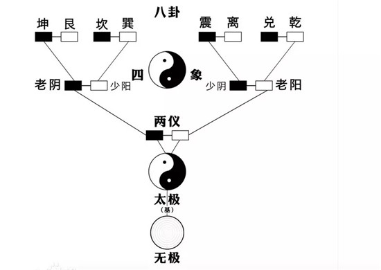 无极生太极,阴阳交合,阴阳二气生成万物是为太极;故《周易.系辞传》称:“易有太极,是生两仪。”